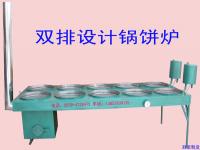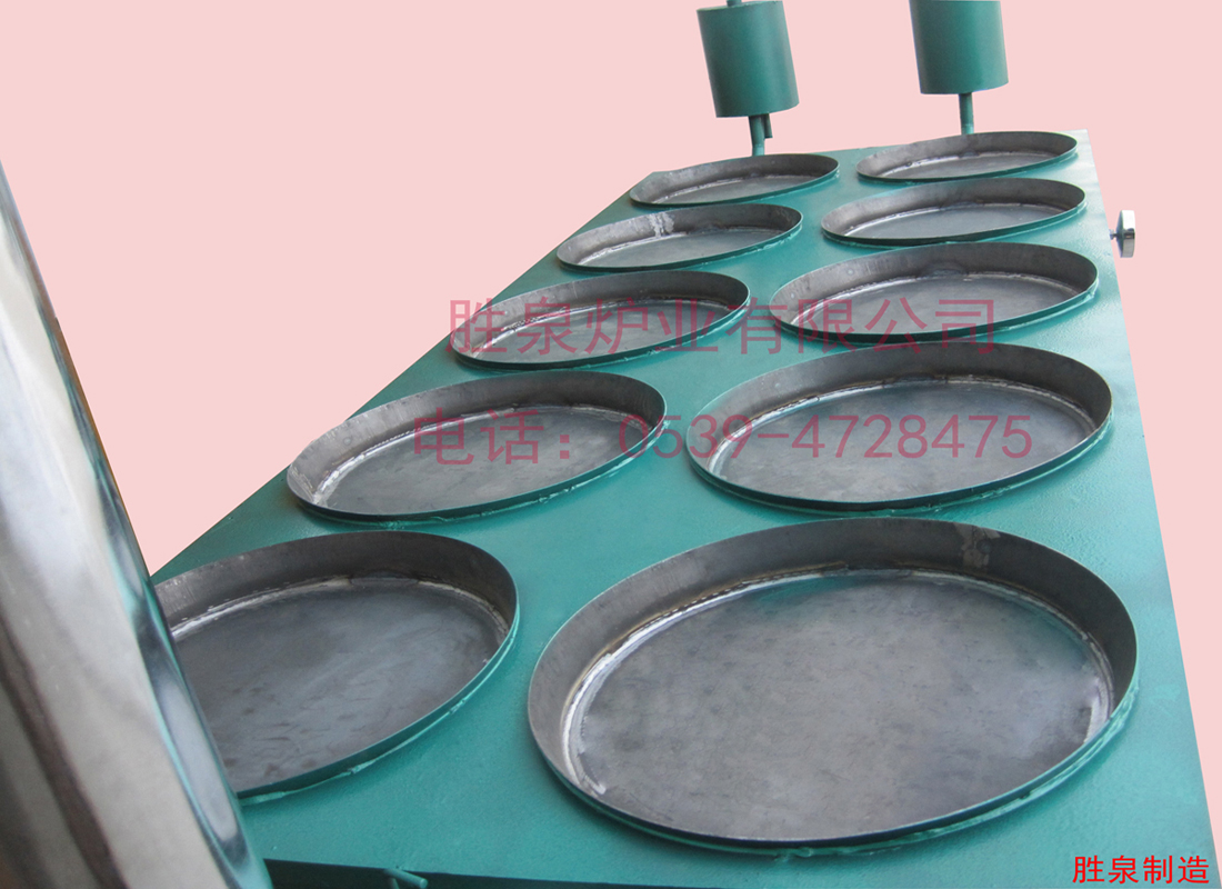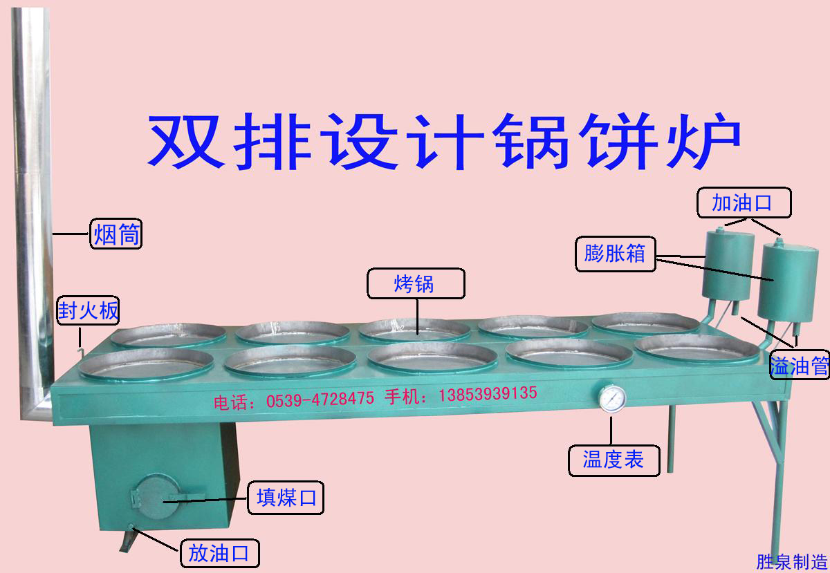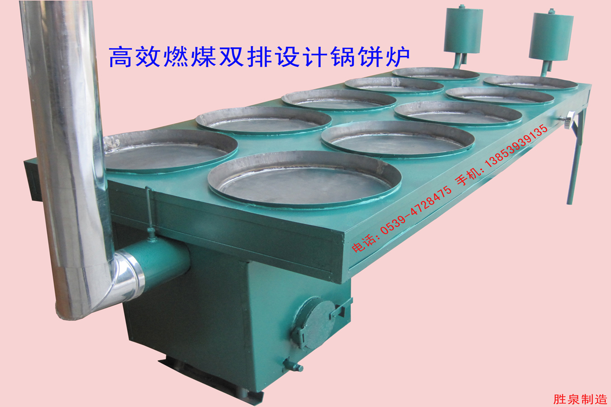 胜泉牌锅饼炉是一种新型燃煤导热油锅饼烤炉,主要烤制锅饼、大饼、烧饼、锅盔饼、火食饼、发面火烧、油饼、水煎包等食品。制造原理是利用煤炭或木柴加热节能锅炉内的导热油,导热油循环至烤锅释放热量烙制食品,然后再循环回锅炉内加热。本实用新型内外构造合理,烤出来的大饼色泽均匀,是传统土炉更新换代的理想产品。 产品优势: 1、双排设计,可节省空间,减短油路循环距离,提高工作效率。 2、锅炉一端与膨胀箱一端烤锅温度一致,烤饼均匀。 3、烤锅由公司专业模具一次冲压成型,锅底平整,与传统铸造铁锅外观一致,方便放饼、转饼、翻饼。 4、烤炉出厂前全部点火试验,用户在到货后无需安装,可直接使用。 5、烤锅可设计在节能锅炉的一端或两端。 6、不用安装鼓风机,30个锅以下无需循环泵,45-50分钟达到所需温度,省时省力省钱。 7、锅饼炉烤锅直径一般为30-60厘米,公司可以根据客户要求订做。 产品实物样品图一:铁板面设计 十个烤锅